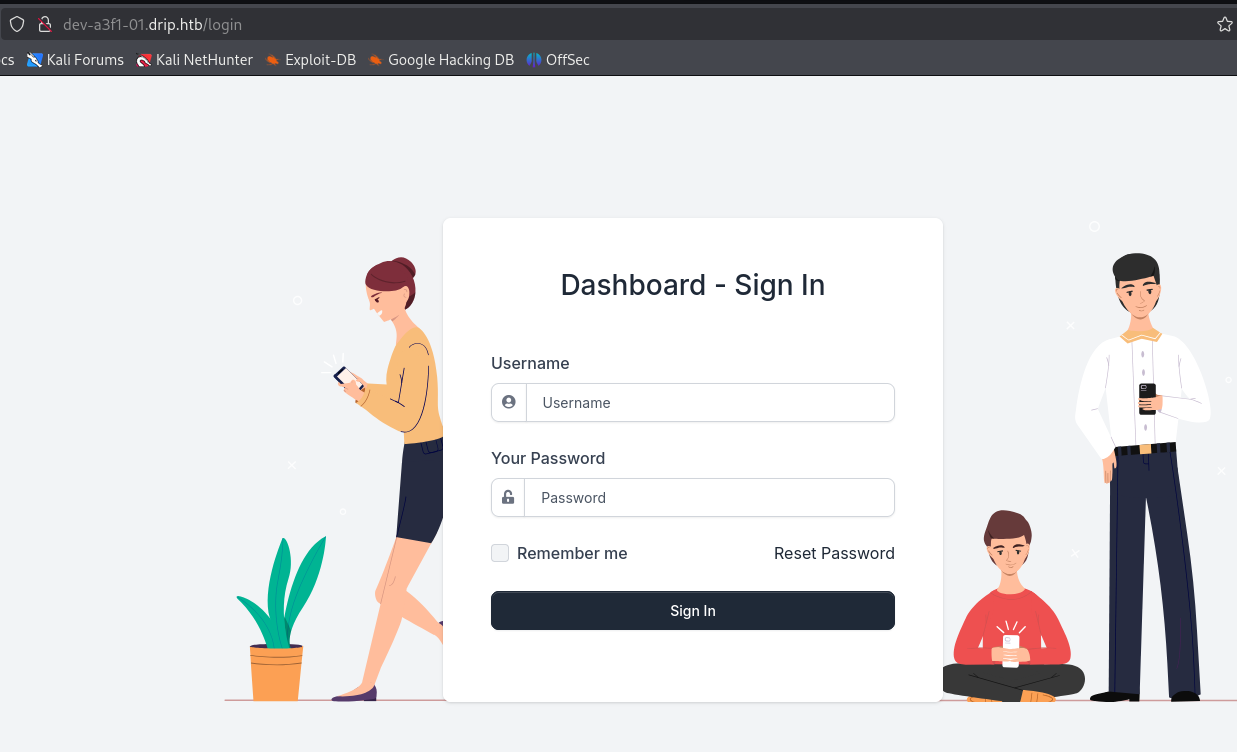 Fuzzing for further vhosts is not successful and fuzzing for files on drip.htb and mail.drip.htb doesn’t turn up any interesting files. drip.darkcorp.htb does.