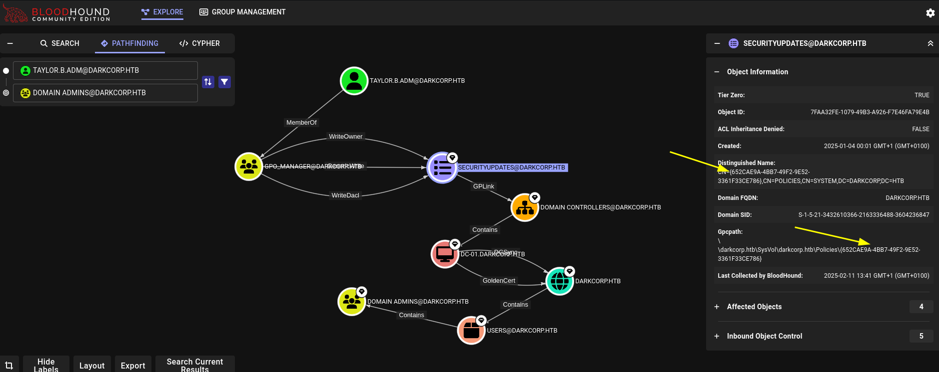 Bloodhound shows that the user is part of the GPO_MANAGER group and has a path to domain admins. We will also need to know the GPO ID of SECURITYUPDATES that is indicated with arrows: 652CAE9A-4BB7-49F2-9E52-3361F33CE786