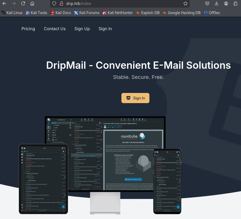 Accessing the website redirects to drip.htb. After adding it to our hosts file we see an email portal.