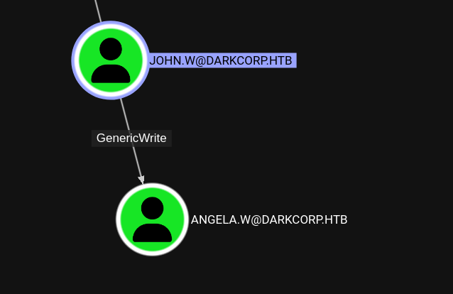 john.w has GenericWrite rights over angela.w. This allows us to change attributes such as the userPrincipalName and servicePrincipalName.