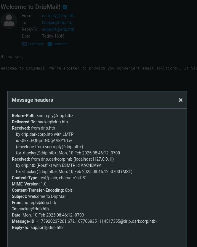 We can freely sign up and get a welcome email. Pointing mail.drip.htb to the target machine is required.