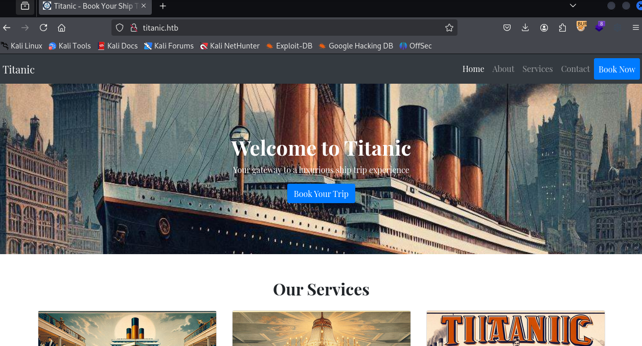 Accessing the website redirects to titanic.htb. After adding it to our hosts file we get to a booking page for titanic trips.